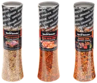Smart krydderikværn i plastbeholder, der indeholder en smagfuld barbecue-krydderiblanding.