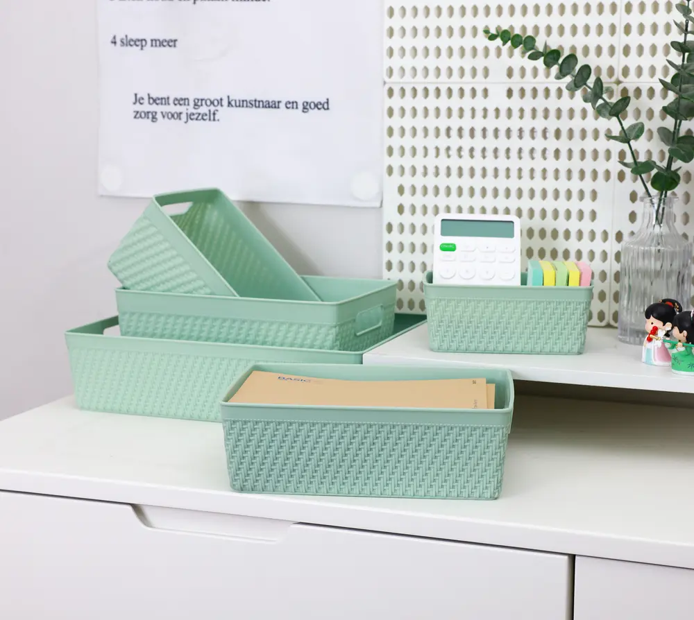 Denne flettede plastikkurv byder på mange opbevaringsmuligheder, lige fra kontorartikler til legetøj på børneværelset.